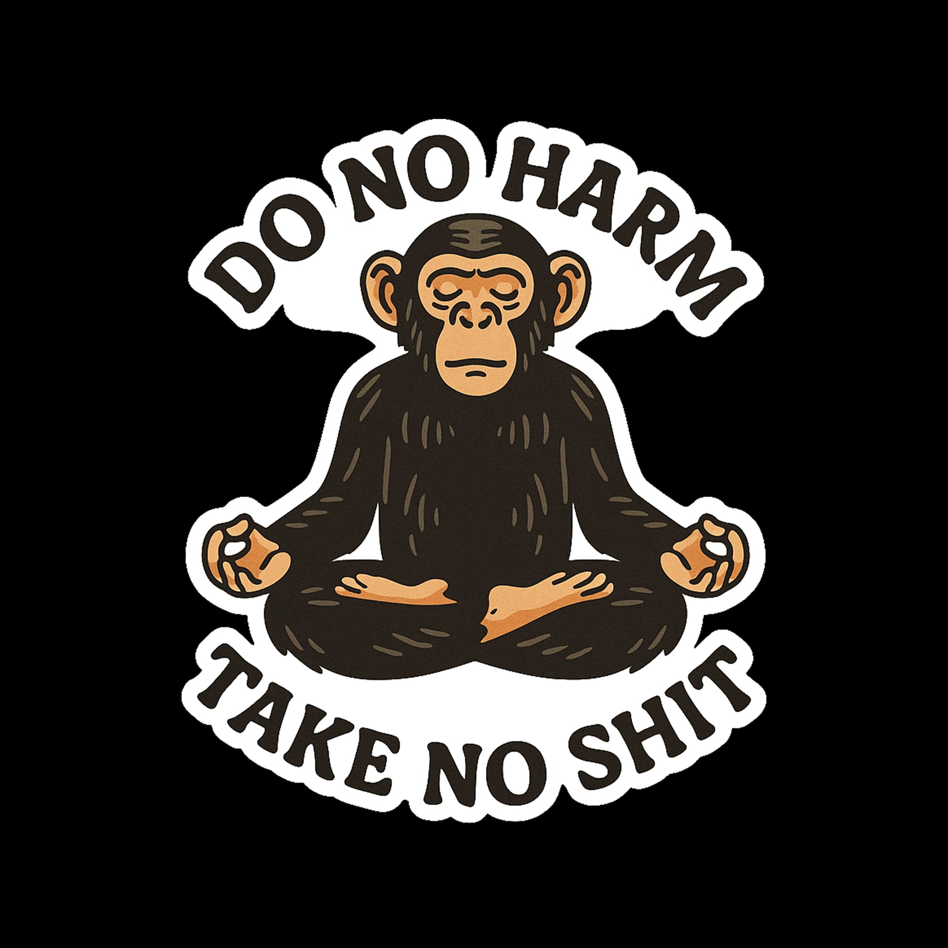 Bring some centered badassery to your gear with our “Do No Harm, Take No Shit” sticker — featuring a meditating chimpanzee in lotus position. With a calm face and perfected posture, this Zen primate reminds you to stay grounded and assertive.