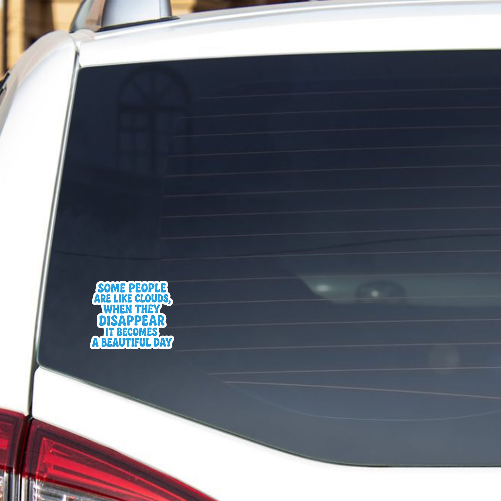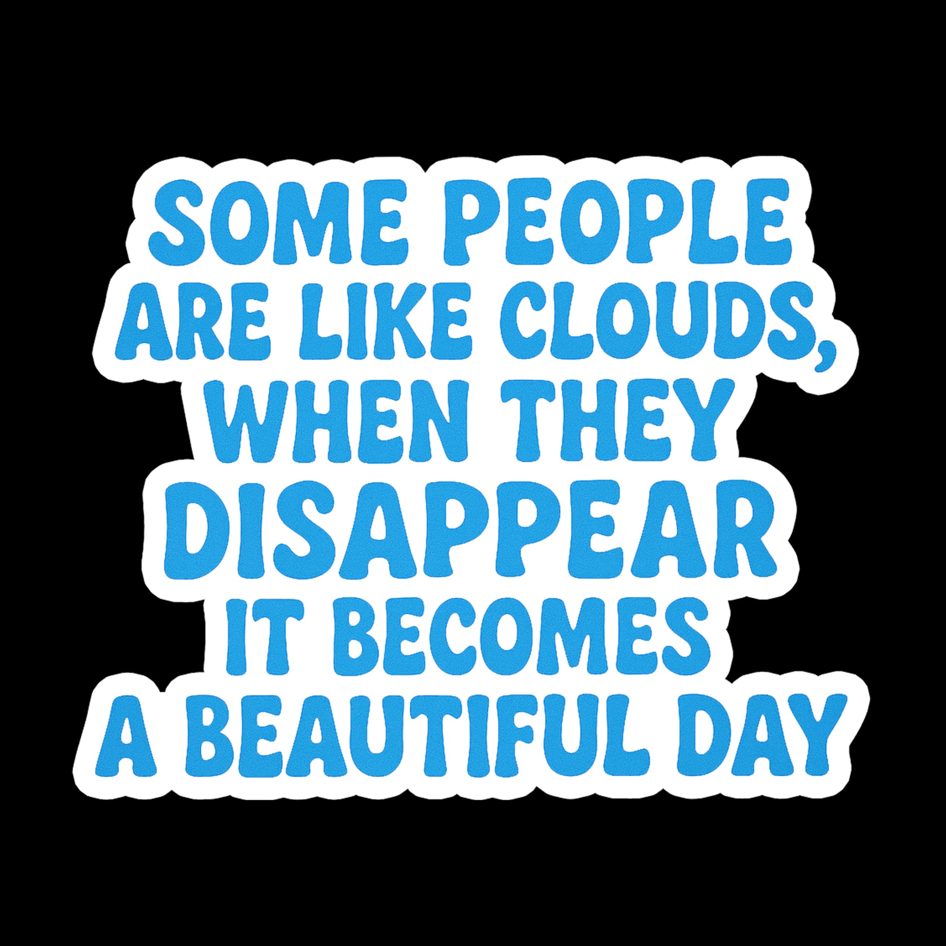 Brighten your day with this witty cloud-themed sticker! Featuring the quote, "Some people are like clouds. When they disappear, it becomes a beautiful day," in bold, puffy lettering outlined in sky blue, this sticker pops beautifully against a sleek black background. Perfect for laptops, water bottles, notebooks, or anywhere you need a dose of humor and honesty.