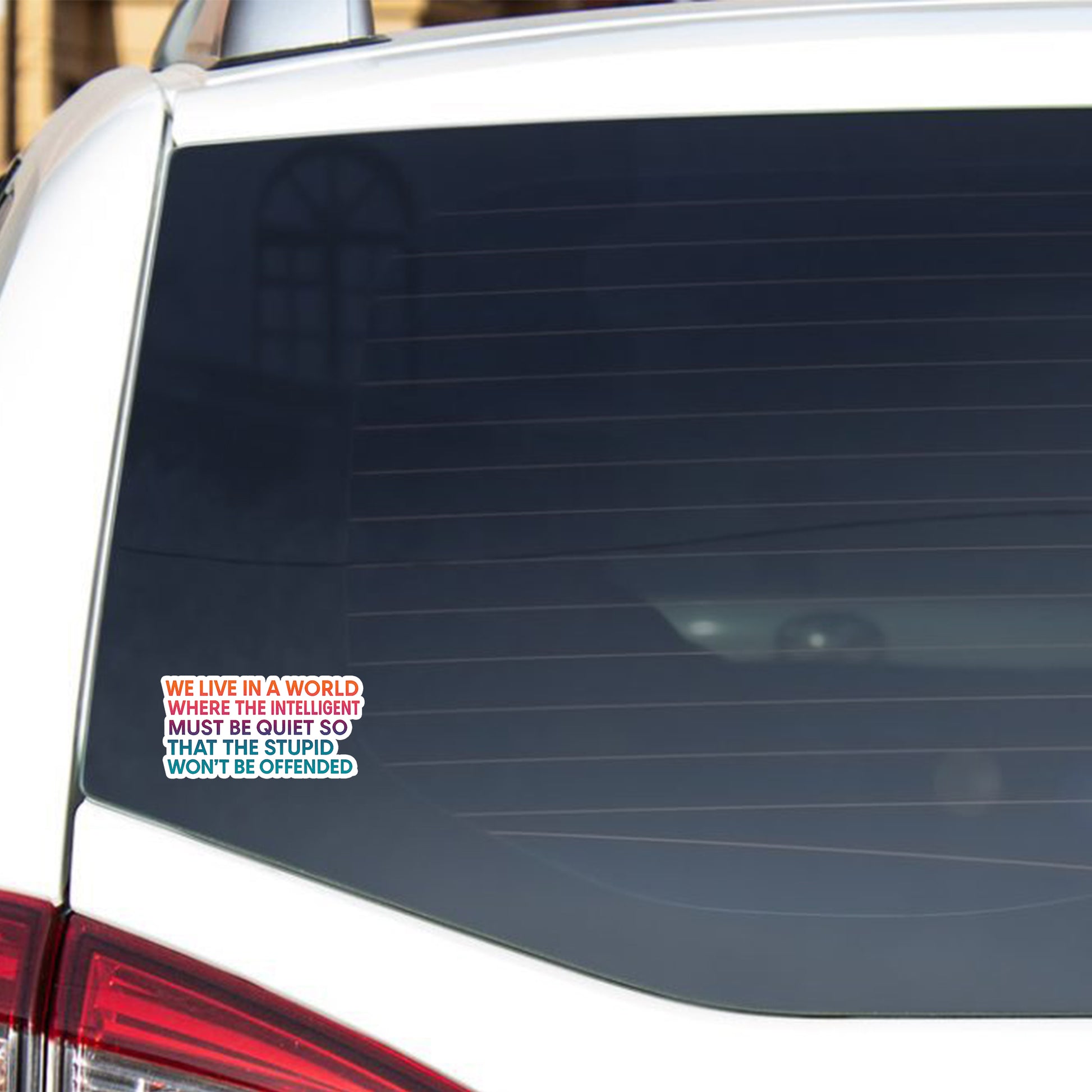 This bold 6" x 3" bumper sticker delivers the sharp message, "We live in a world where the intelligent must be quiet so that the stupid won't be offended" in a clean, modern font with a sunset-colored gradient. Printed on weatherproof vinyl with a white background—ideal for cars, laptops, or anywhere you want to speak up without saying a word.
